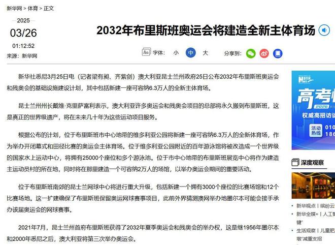 官方披露的场馆规划明确指出:2032年奥运会超八成比赛场地将依托既有设施改造升级或直接启用,全新建设比例严格控制在20%以内。