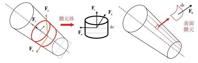 将上述体段分别取出,并对其进行受力分析。通过达朗贝尔原理构建包含惯性力Fa、浮力Fb、以及径向拖曳力Ft和轴向拖曳力Fn的受力平衡方程,实现对人体所受流体作用力的建模及求解。微元受力分析如图五所示。