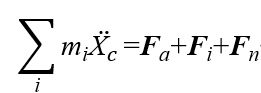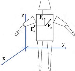 如图四所示,假设C点为人体质心,设人体的质心在地面绝对坐标系中的坐标向量为Xc,各体段质量为mi,再假设受到的流体力三个分量Fa、Ft、Fn。根据牛顿第二定律给出人体动力学方程: