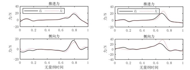 其中,小臂受力存在左右侧不对称的现象,进一步计算的肩、肘关节力矩也表现不对称现象,这是由于优势侧、发育等因素导致的不对称普遍存在[2],因此可认为是运动员个性化特征的体现。大腿与小腿推进力左右侧最大差值为4.7 N、9.3 N,大臂与小臂推进力左右侧最大差值为1.8 N、5.3 N。此外,对比小腿的侧向力也可发现此情况。