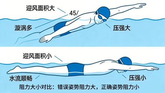 比如自由泳时,身体尽量贴近水面,只露出肩部与头顶;比如蛙泳时,收腿尽量控制膝关节外展,划臂后迅速向前伸展,使身体形成一条直线。如果出现姿势偏差,比如抬头挺胸游泳,身体就会变成迎风面,压差阻力会瞬间增大,游起来会更累更慢。