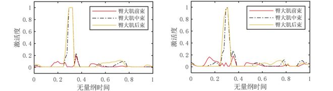 其中,以激活度0.1作为肌群激活的判断阈值[3],则股二头肌首先发力,其次是股直肌,再者是阔筋膜张肌,最后是臀大肌。