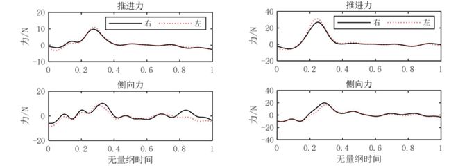 从前后方向上看,蹬腿过程中小腿所产生的流体作用力最大,其次是大腿。大腿与小腿所受非定常流体力的极值为31.2 N、10.9 N。