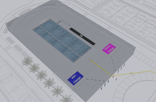 06 比赛路线. 游泳赛段在室内泳池进行,单圈距离为100M,游2圈,游泳总距离为200M。