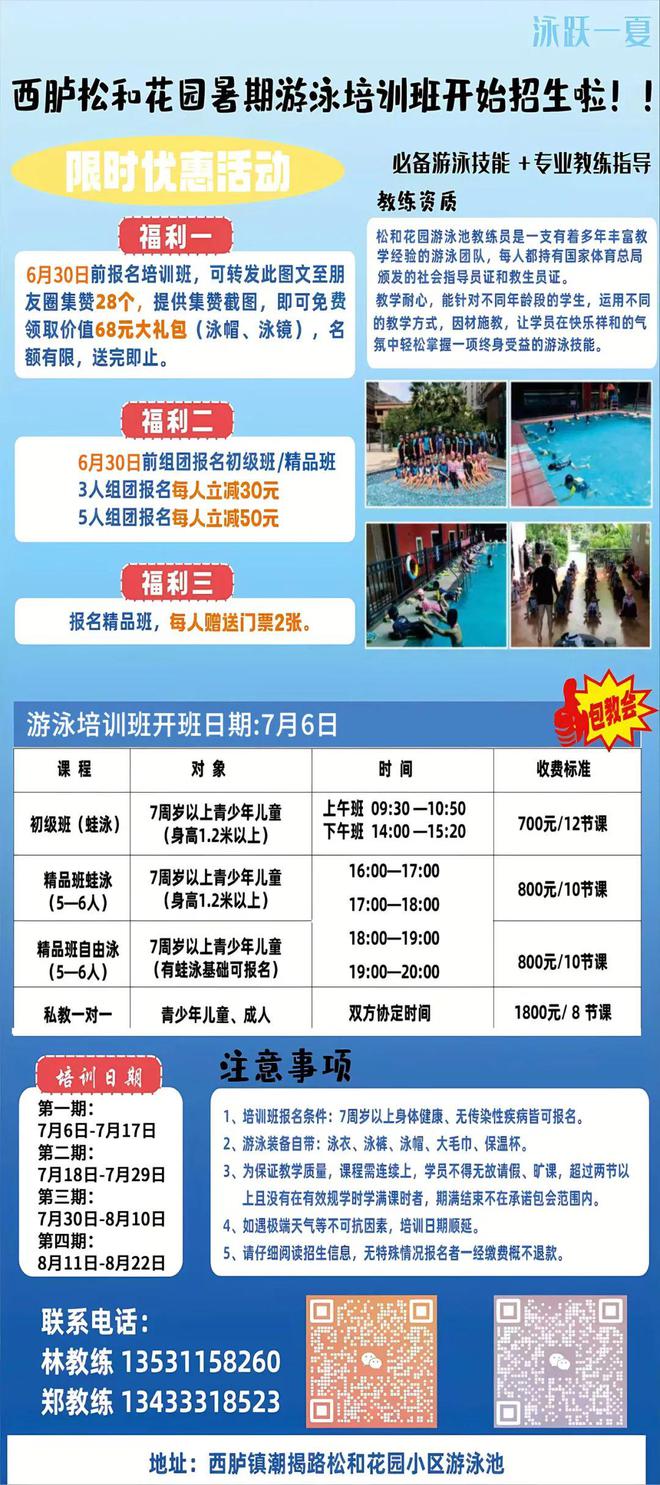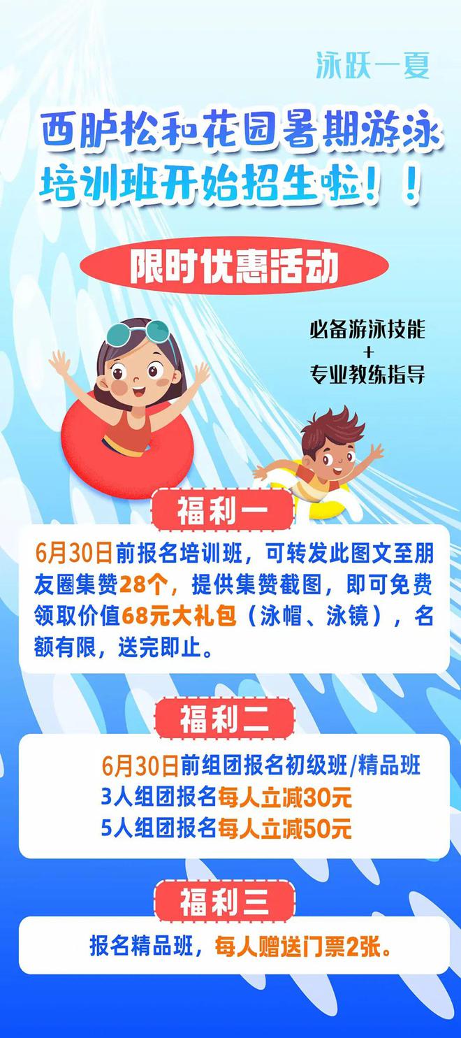 为了回馈新老学员的支持与厚爱,松和花园游泳池特别推出限时优惠活动!即日起至6月30日,报名参加泳池培训班即可享受以下福利: