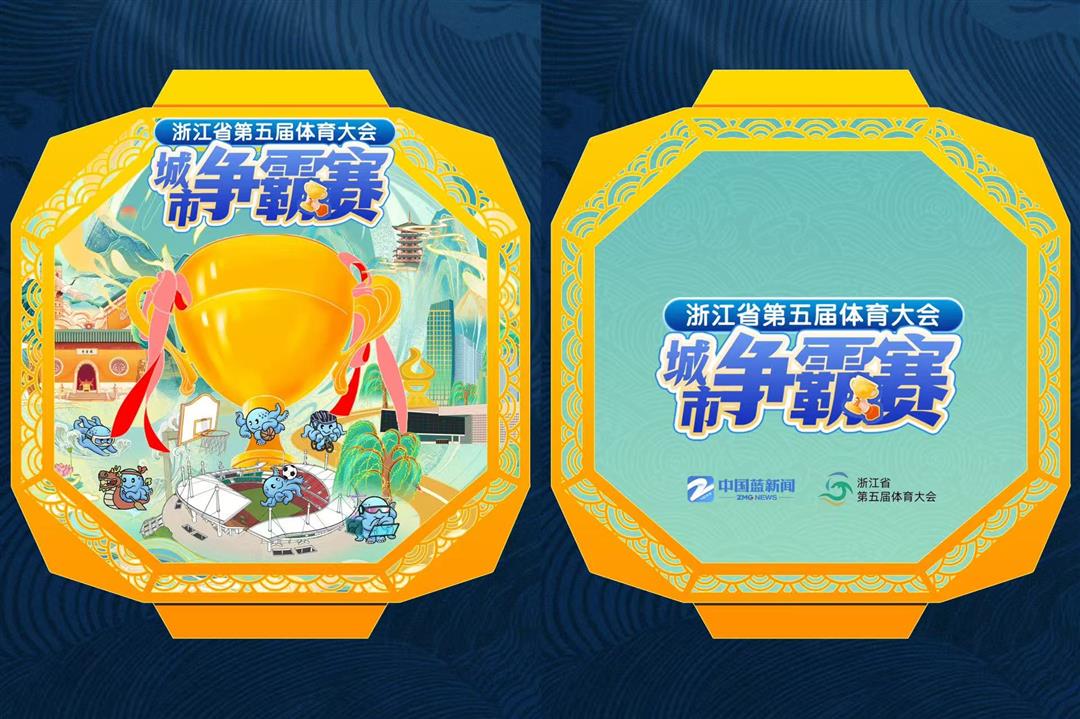 人人爱体育,潮起山海间。徽章以本届运动会吉祥物“望潮”为设计主体,巧妙融合6大线上互动项目:智慧交锋的答题、劈波斩浪的龙舟、奋勇向前的游泳、风驰电掣的自行车、激情碰撞的篮球与精彩热血的足球,生动展现线上线下的运动激情。徽章边框以本届赛事奖牌为灵感,以台州仙居文化瑰宝——无骨花灯为轮廓,非遗文化为徽章注入深厚的文化底蕴与地域特色。徽章被动感流畅的海浪纹环绕,呼应山海激情,城市战队间激烈的线上角逐与拼搏不息的精神在数字云端激荡,凝聚山海浙江的运动活力与文化传承。